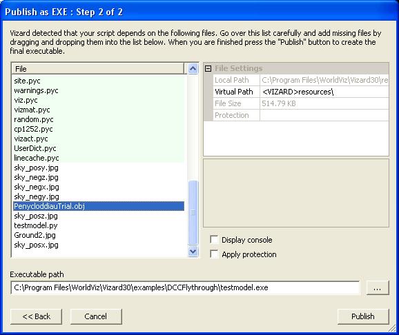 Hi - the model file (PenycloddiaTrial.obj) is in the Vizard Resources folder, along with the texture - see attached files showing virtual path for both. The Vizard script is in a subdirectory of the Vizard examples folder. On previous occasions this always seemed to work fine and it still does, with the exception of the executable.