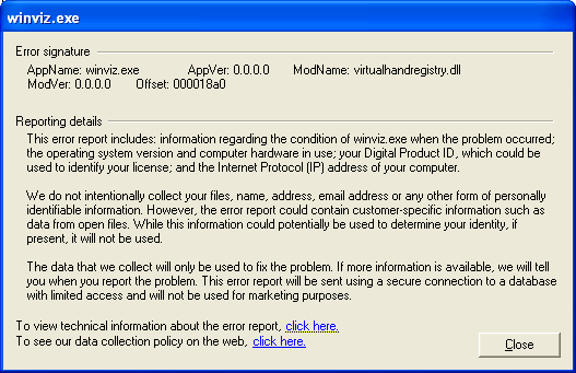 First I run the virtual hand device manager followed by the DCU. The DCU successfully shows the movement of my hand / fingers. Next when starting up a vizard demo, Winviz.exe crashes and supplies the error dialog boxes (see the bitmaps).