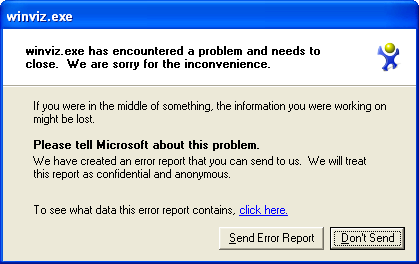 First I run the virtual hand device manager followed by the DCU. The DCU successfully shows the movement of my hand / fingers. Next when starting up a vizard demo, Winviz.exe crashes and supplies the error dialog boxes (see the bitmaps). I just installed the newest version of Vizard today, as well as uninstalling and reinstalling the Virtual Hand SDK. I did have some problems with the SDK working initially, however. I had an issue getting the authorization utility to work. The utility issued the following error: Init Failure: NETWORK: REPLY FROM NETWORK DRIVER IS BAD (-103) for C:\....\LICENSE.TXT. In order to fix this issue, I had to delete the c:\windows\system32\esnecil.ind file and re-booted my machine. I am wondering if this would have anything to do with Winviz.exe crashing. Please help! Thanks. |