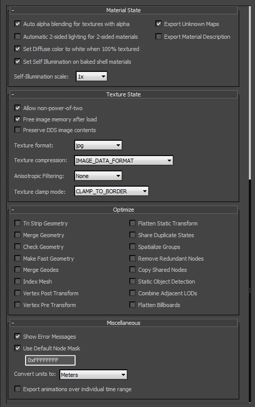 New here. Trying to export some textures to Vizard with the OSGB plugin. However, when using the plugin to export, my textures become all psychedelic. I've attached some SS of what the textures look like and my export options in 3ds with the OSGB plugin. If anyone has any suggestions, I'd gladly accept them