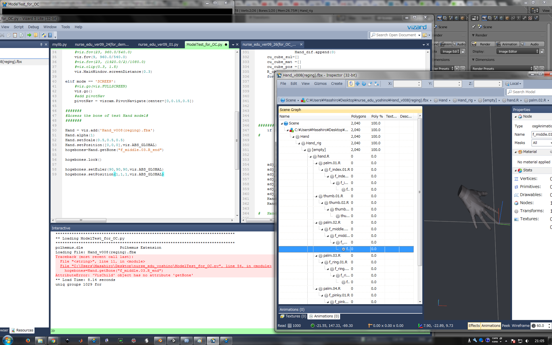 The goal is to move a 3D model of hand based on the data measured with Mo - cap. The hand model in the Vizard has confirmed accurate operation, but I need a more accurate hand model. So, I created a 3D model of hand using blender, made a rig and exported it as an fbx format file. However, there are some empty nodes in the inspector on Vizard, and an error occurs when getBone. ![]() (AttributeError: 'VizChild' object has no attribute 'getBone') Please let me know the solution. Hope to hear from you soon. |