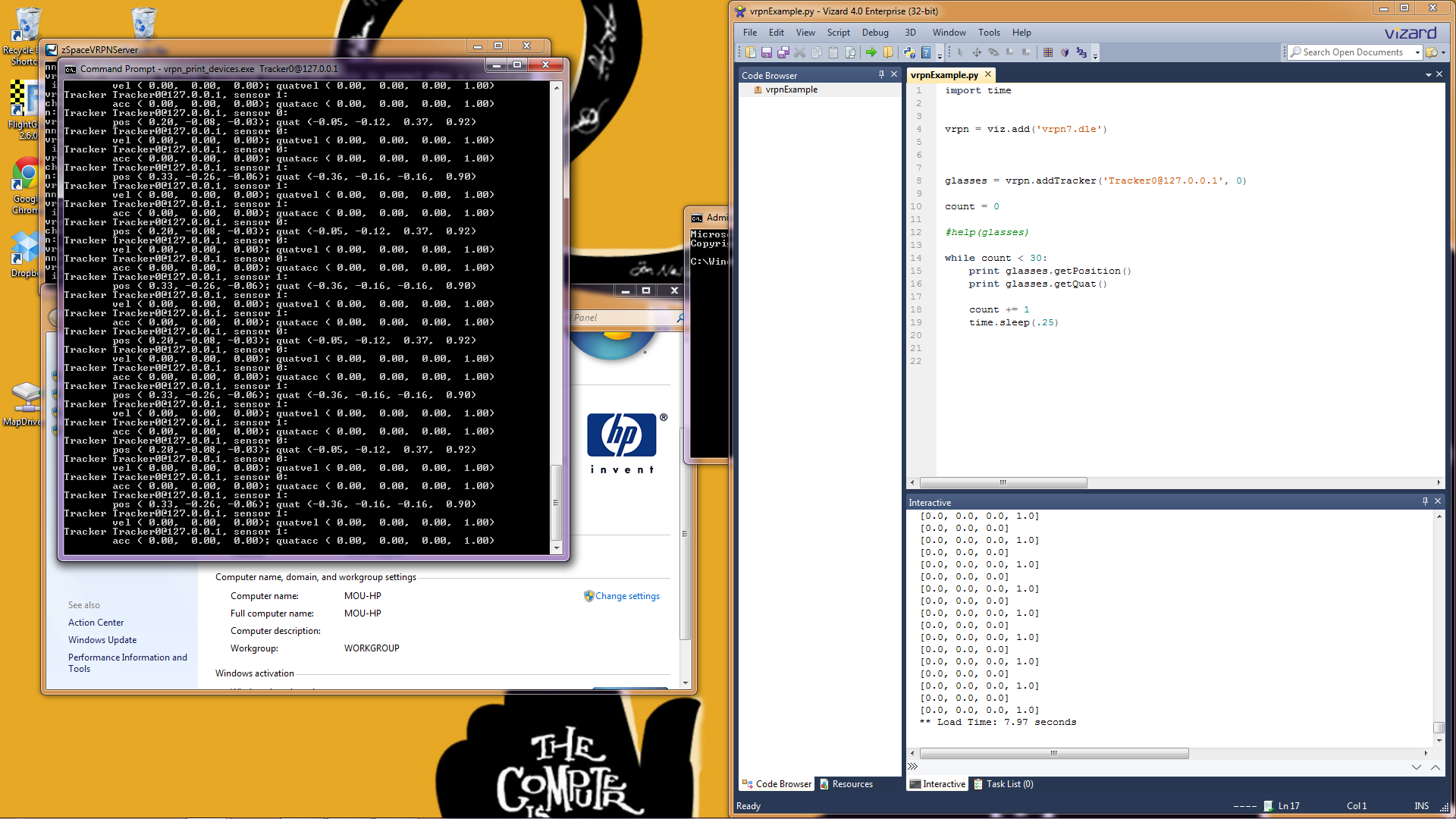 I am attempting to read tracker data from a ZSpace system in Vizard. I am able to connect to the VRPN server using the vrpn_print_devices program provided with VRPN. When I connect using the same tracker and server name from Vizard I always get [0.0, 0.0, 0.0] for the tracker position.