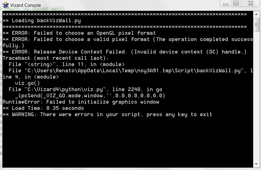 Failed to choose an OpenGL pixel format.I tried to reinstall vizard (I removed the license first) but it still doesnt work. What should I do? I am attaching a screenshot of the problem. |