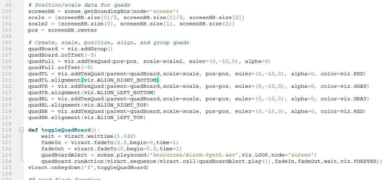 Goal is to attach 4 quads to the pit screen, thus dividing it into quarters. Then create a sequence that on a key down will give the effect of the quads flashing. I also have a sound clip that goes in sequence with the flashing.