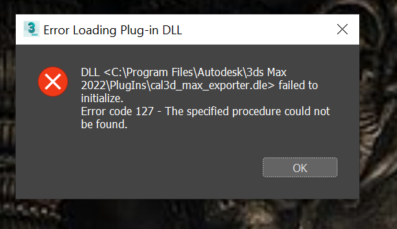 Upon starting 3ds Max, the following error message occurs (PFA snapshot). However I have added Cal3d_max_exporter.dle in plugins directory. I am using 3ds Max 2022. |