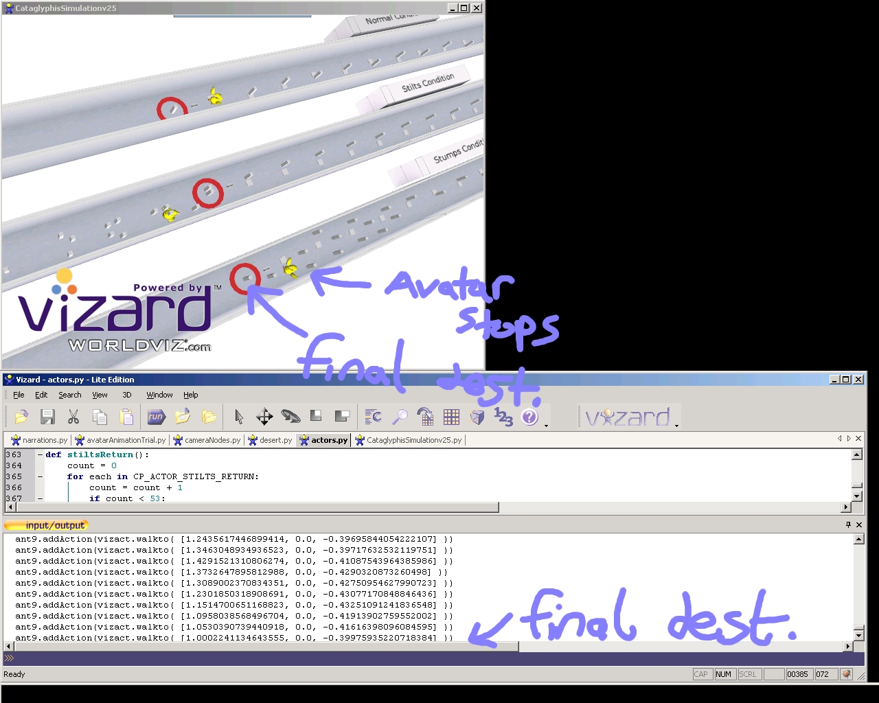 Vizard read them okay. Please see the terminal window. However, Vizard did not finish the movement properly. The ducks are 1 coordinate behind the final destinations.