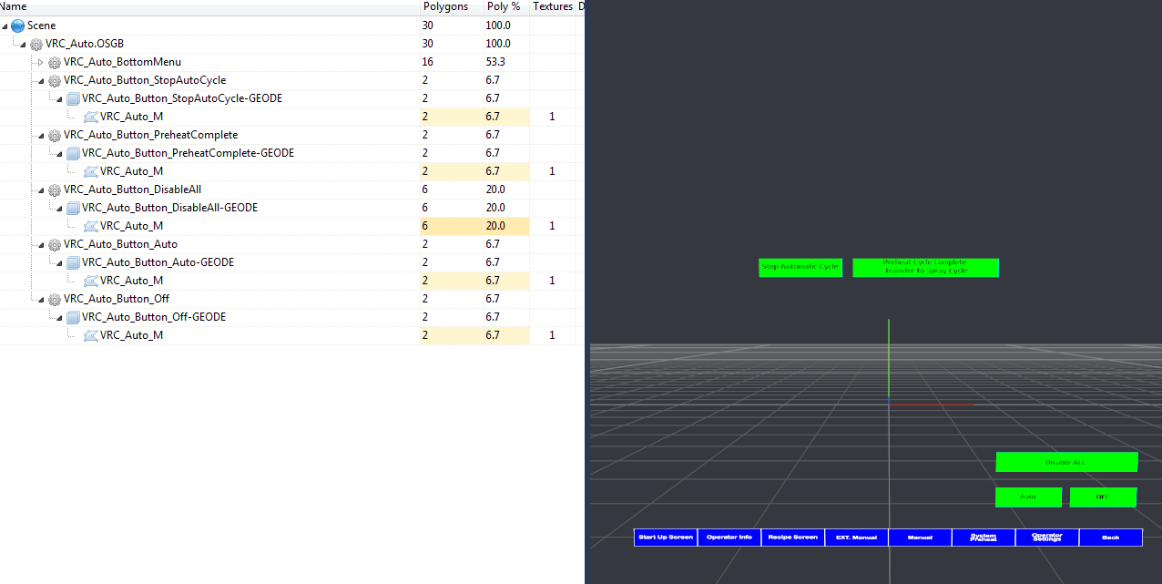 line = viz.screentoworld( viz.mouse.getPosition() ) intersection = viz.intersect( line[0:3], line[3:] ) print 'intersection:', intersection.object print 'intersection:', intersection.name I wanted the intersection test to detect each object independently of one another, but all I get is the following on everything I click on: intersection: __main__.VRC_Auto(1) intersection: VRC_Auto_M Now, in the case of a different object with no materials attached, I get the geode returned to me instead. And I am able to easily delineate between the objects by the name and when I perform an intersection I can make all the special events ( such as activate animations happen) just fine. (see the second image). Thank you, George |