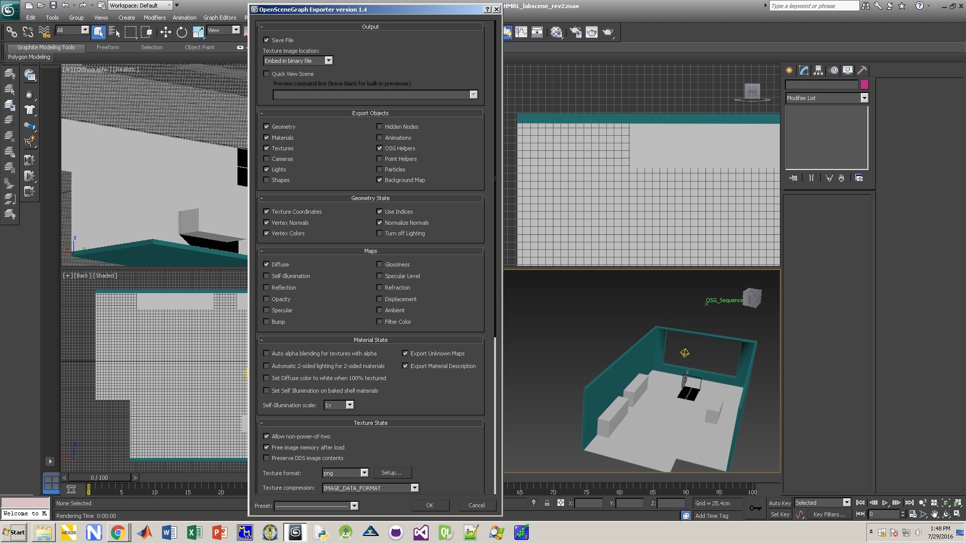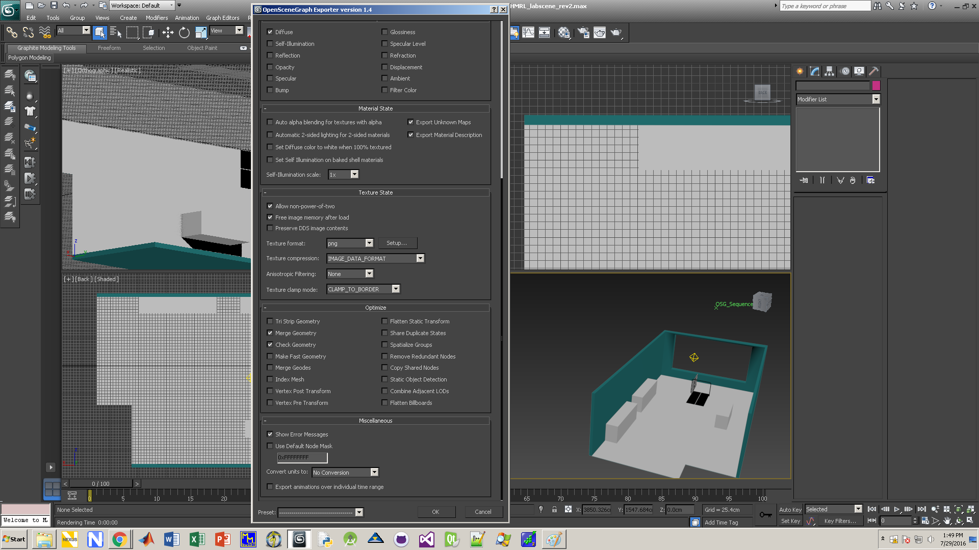 I know this has been a topic a few times, but I can't figure out how to get the osgb exporter in 3ds to export my diffuse maps correctly. I've attached images of my desired export result, how it looks when rendered in 3ds, and my osgb export settings. I apologize the screen shot from Vizard is dark, but the issue is that none of my maps made it through the export process.