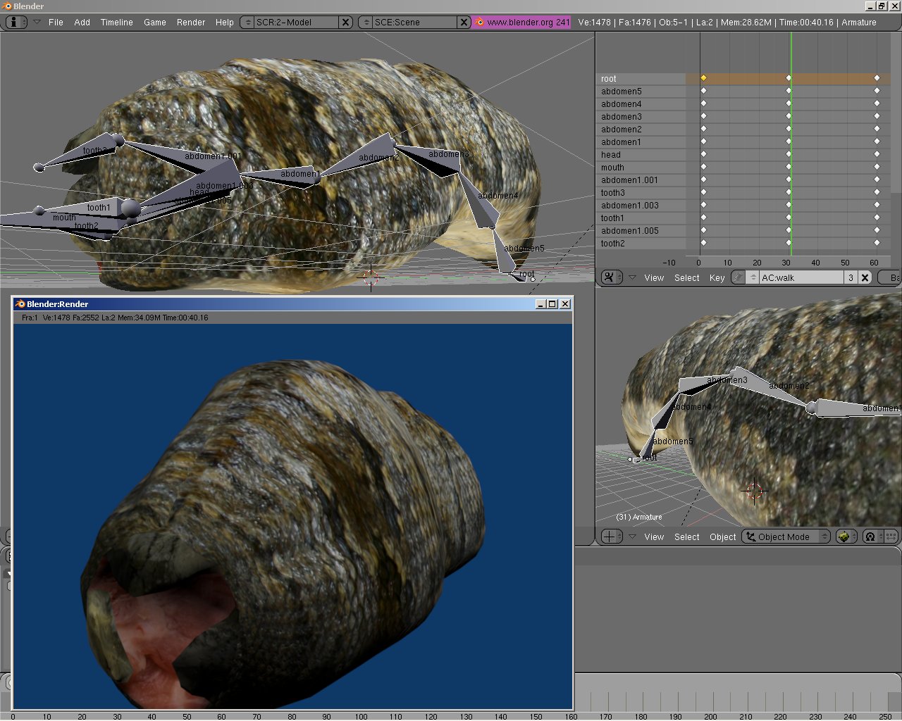 The texture didn't appear and the animation seems to be VERY VERY exagerated, as if I double the value of rotation-translation or something (bones seems to be displaced or scale up).The root bone wasn't animated at all (tail) but it appears to be animated.