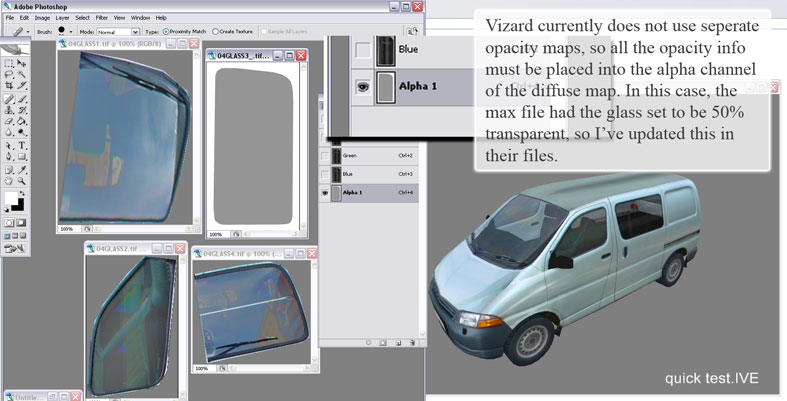 On another note, vizard cannot handle separate opacity maps, and instead uses whatever is in the alpha channel of the diffuse texture. Since the max file is basically making the windows 50% transparent, for your convenience I've attached modified versions of the glass textures that have been changed to take that into account. The last attached image (opacity note.jpg) shows the changes.