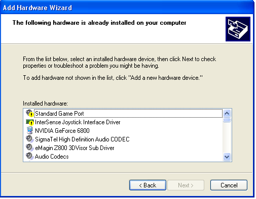 I followed the instructions and apparently there is some kind of error. I've attached a screenshot that shows the exclamation marks that come up next to the standard game port and the Intersense Joystick Interface Driver. Has anyone else encountered this and does anyone know of a fix.