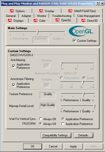 Yes, all textures are affected (at least those in the tutorial examples). Here is a screen shot of the OpenGL settings window for the ATI Radeon 9700/9500 card. [QUOTE] There should be an option "Wait for Vertical Sync", you want to set this to "Always On". Clearly, there is no "Always On" option, hence my confusion. The settings shown in the attachment are the defaults. |