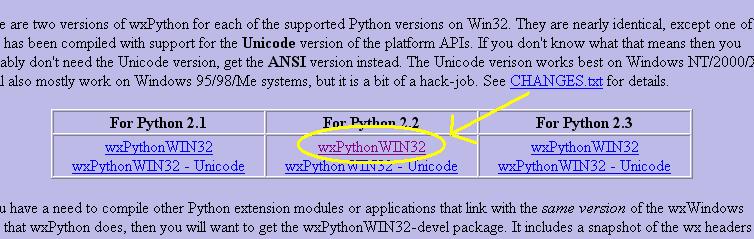 Under Win32 click on the link to download wxPython for Python 2.3. There will be an ansi version and a Unicode version, download the ansi version. Follow the link and download the file to your computer.