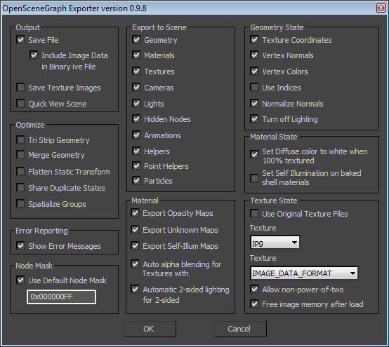 There seems to be a misunderstanding here. In 3ds max, maps and materials are separete things. Maps/textures are contained within materials. For exporting, you need to be using the "Standard" material type with your texture in the Diffuse, Self-Illumination or Reflection slot. I've attached a screenshot of the recommend OSG Exporter settings. |
